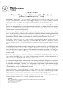 En conséquence, le Gouvernement congolais demande à la communauté internationale d’adopter « des mesures contraignantes », dont des sanctions, pour garantir l’application de l’Accord de Washington signé sous l’égide de Donald J. Trump.