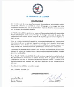 Par ailleurs, la coalition Lamuka encourage la nation à se liguer à toute forme de campagne qui sera entreprise dans le souci de soulager le besoin des sinistrés du volcan Nyoragongo le Samedi 22 Mai dernier.