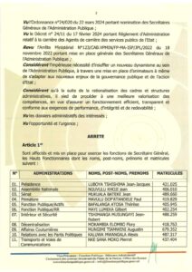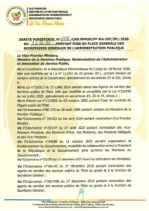 Vendredi, 30 janvier 2026-Le Gouvernement de la République démocratique du Congo a procédé à une nouvelle mise en place des Secrétaires généraux de l’Administration publique, à travers un arrêté ministériel signé le 28 janvier 2026 par le Vice-Premier ministre en charge de la Fonction publique, de la Modernisation de l’administration et de l’Innovation du service public.