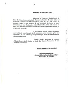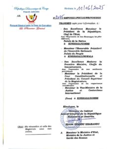 Jeudi, le 12 juin 2025-Le Procureur Général près la Cour de Cassation, par l’entremise de son Directeur de Cabinet, Me Simon Nyandu Shabandu, a répondu à la correspondance officielle au Ministre d’État en charge de la Justice et Garde des Sceaux, Constant Mutamba, portant sur la récusation de tous les magistrats dans l’affaire de détournement des deniers publics le concernant.