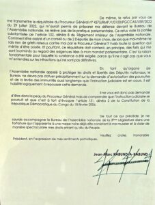 J’aimerais faire observer que la surséance sollicitée, dans ma lettre référencée N/Réf : 002/AN/DN/JMKK/2022 du 04 août 2022, se justifie par le fait que le Parquet Général près la Cour de Cassation n’a pas encore clôturé l’instruction judiciaire, qui a été déclenchée à la suite de l’autorisation d’instruction contre moi, accordée par le Bureau de l’Assemblée nationale.