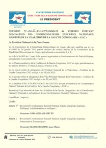 Samedi, 9 août 2025 – La Coalition de la Gauche Congolaise (CGC) a procédé à la nomination de plusieurs Coordonnateurs Exécutifs Nationaux Adjoints, marquant ainsi un renforcement de son équipe dirigeante. Cette décision a été officialisée par le Président National de la plateforme, Jean-Marc Kabund à travers la Décision N°002/CGC/PN/JMKK/25 du 07 août 2025.