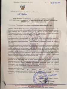 « En entendant que la décision lui soit notifié, le ministère de l’ESU tient à faire la mise au point suivant : qu’il s’agisse de la suspension, qu’il s’agisse de toute autre décision concernant sa note circulaire, il rappelle que le dossier des universités autorisées à faire fonctionner les facultés de médecine a déjà fait l’objet d’un arrêté ministériel postérieur à la dire note circulaire… Un quelconque débat sur cette note est donc aujourd’hui dans objet. Tout en reconnaissant que les établissements auxquels l’autorisation pour les facultés de médecine a été retirée ont le droit de faire tous les recours légaux envisageables , le ministère encourage les univers qui ont le projet d’ouverture ou de réouverture de la filière médecine à travailler plutôt à réunir les conditions exigées, notamment un personnel académique propre, des cliniques universitaires avec laboratoires équipés, une bibliothèque appropriée, des bureaux et auditoires appropriés, avant de revenir solliciter l’autorisation nécessaire », souligne la mise au point signée par le Professeur Florent Mulumba Muadi, Directeur de Cabinet Adjoint du ministre MUHINDO.