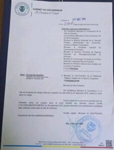 Selon le document, le gouvernement provincial dit avoir reçu la lettre d’information de la CGC concernant la tenue de la marche. Toutefois, il explique ne pas pouvoir prendre acte de cette manifestation car l’itinéraire proposé traverse une zone frappée d’interdiction, conformément à l’arrêté SC/329/CAB/GVK/GVM/2021 du 30 septembre 2021.