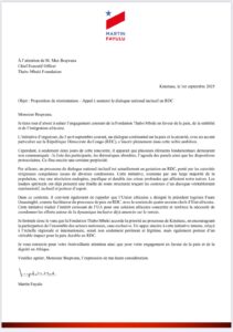 Lundi, 1er septembre 2025 – L’opposant congolais Martin Fayulu a adressé une lettre ouverte à M. Max Boqwana, Chief Executive Officer de la Fondation Thabo Mbeki, appelant à un recentrage de l’attention sur le processus de dialogue national inclusif en République démocratique du Congo (RDC).