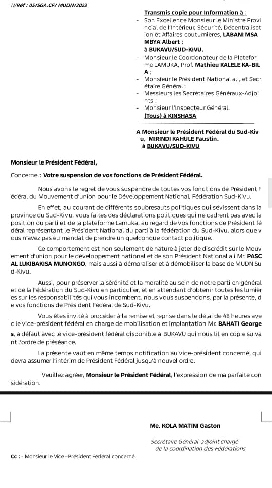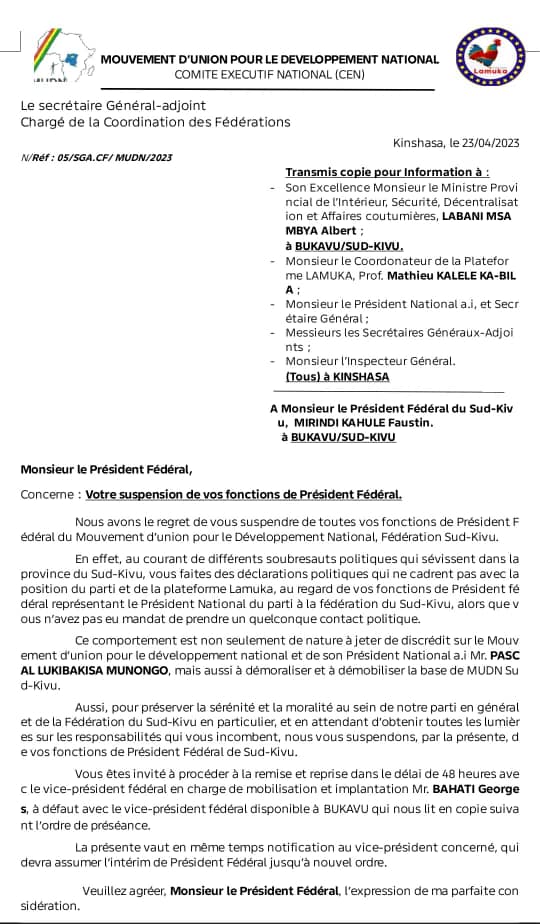 Nous avons le regret de vous suspendre de toutes vos fonctions de Président Fédéral du Mouvement d’union pour le Développement National, Fédération Sud-Kivu.
