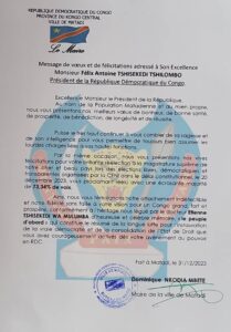 Par la même occasion, nous vous présentons nos vives félicitations pour votre brillante réélection à la magistrature suprême de notre cher et beau pays lors des élections libres, démocratiques et transparentes organisées par la CENI dans le délai constitutionnel, le 20 décembre 2023, vous proclamant réélu avec une écrasante majorité de 73,34% de volx.
