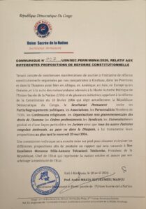 Lundi, 20 avril 2026-À Kinshasa, l’Union Sacrée de la Nation a officiellement ouvert le débat sur une éventuelle réforme de la Constitution du 18 février 2006. Dans un communiqué signé le 20 avril 2026 par son Secrétariat permanent, la plateforme politique appelle les forces vives de la nation à soumettre leurs propositions en vue d’une révision du texte fondamental.