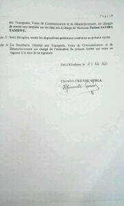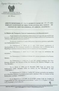 12 juillet 2021-Le ministre des transports et voies de communication, Chérubin Okende vient de suspendre Patient Sayiba, Directeur Général de l’Office de la gestion de Fret Maritime, OGEFREM.