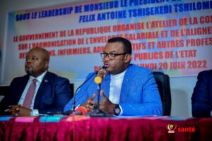 Kinshasa, le 18 Juin 2022-Très attendus, notamment par les agents et fonctionnaires de l’état du secteur de la Santé, les travaux de l’Harmonisation de l’enveloppe salariale et de l’alignement à la prime de risques des médecins, des médecins, infirmiers, administratifs et autres professionnels de la Santé œuvrant dans les services publics de l’Etat en République Démocratique du Congo ont été lancés, ce samedi 18 juin 2022 au Village Venus, à Bibwa dans la commune de la N’sele, à Kinshasa. C’est Jean-Pierre LIHAU, Vice-Premier Ministre, Ministre de la Fonction publique, Modernisation de l’administration et Innovation du Service public qui a procédé au lancement officiel de ces assises organisées par le Gouvernement de la république sous le leadership du Président de la République, Félix Antoine Tshisekedi.
