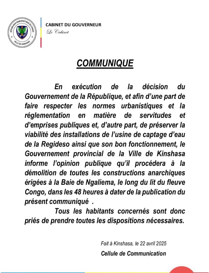 « En exécution de la décision du Gouvernement de la République, et afin d’une part de faire respecter les normes urbanistiques et la réglementation en matière de servitudes et d’emprises publiques et, d’autre part, de préserver la viabilité des installations de l’usine de captage d’eau de la Regideso ainsi que son bon fonctionnement, le Gouvernement provincial de la Ville de Kinshasa informe l’opinion publique qu’il procédera à la démolition de toutes les constructions anarchiques érigées à la Baie de Ngaliema, le long du lit du fleuve Congo, dans les 48 heures à dater de la publication du présent communiqué », peut-on lire dans ce document.