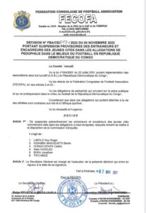Lundi, 7 novembre 2022-C’est par un communiqué rendu public ce lundi 7 novembre 2022 et signé par Donatien Tshimanga que la Fédération Congolaise de Football Association a annoncé la suspension de tous les entraîneurs cités dans le dossier de pédophilie.