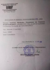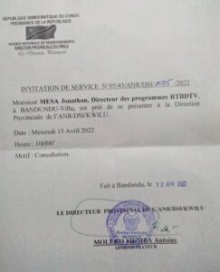 Mercredi, 13 avril 2022-Les professionnels des médias locaux Jonathan Mesa Luma et Mardochée Tayeye résidents à Bandundu, chef lieu des institutions provinciales du Kwilu sont convoqués à l’Agence Nationale des Renseignements ANR de la province du Kwilu.