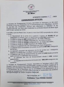 C’est ce qui ressort d’un communiqué officiel signé par le Ministre de l’Enseignement Primaire, Secondaire et Technique, le Professeur Tony Mwaba Kazadi, rendu public ce mercredi 05 mai 2023 qui indique qu’outre les mises à jour, la paie du mois d’avril comprendra les actions suivantes :