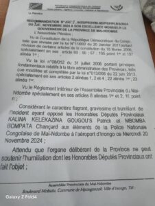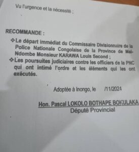 Jeudi, 21 novembre 2024-Toute affaire cessante, le Commissaire Provincial de la Police Nationale Congolaise de la Province du Maï-Ndombe, le Commissaire Divisionnaire Karawa Dengamo Louis Second doit quitté la Province suite au traitement cruel, dégradant et inhumain administré à deux députés provinciaux lors de sa descente à l’aérodrome d’Inongo. C’est l’une des résolutions prises et adoptées par la majorité des Élus Provinciaux du Maï-Ndombe ce Mercredi, 20 Novembre 2024 au cours d’une plénière d’urgence qu’ils ont ténu à l’hémicycle de l’organe délibérant après l’incident survenu entre quelques éléments de la police Nationale Congolaise.