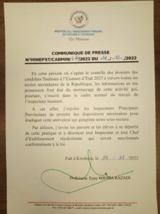 « J’en joins les inspecteurs principaux provinciaux de prendre des dispositions nécessaires pour éradiquer cette anti valeur qui gangrène notre sous-secteur », peut-on lire dans ce communiqué.