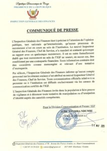 En outre, l’Inspection Générale des Finances informe qu’aucun compte personnel sur les réseaux sociaux n’est attribué à l’actuel Inspecteur Général. Toute communication officielle relative à sa personne ou à l’IGF est diffusée exclusivement via les canaux certifiés de l’institution.