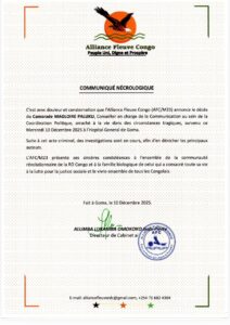 Le communiqué salue la mémoire d’un homme présenté comme dévoué « à la lutte pour la justice sociale et le vivre-ensemble des Congolais ».