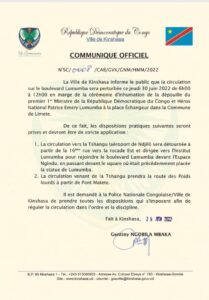 Mercredi, 29 juin 2022-Dans un communiqué signé par le Gouverneur Gentiny Ngobila Mbala et parvenu à Okapinews.net ce mercredi 29 juin, l’hôtel de ville de Kinshasa annonce la perturbation de la circulation sur le boulevard Lumumba ce jeudi 30 juin 2022 de 6h00 à 12h00 en marge de la cérémonie d’inhumation de la dépouille du premier 1er Ministre de la République Démocratique du Congo et Héros National Patrice Emery Lumumba à la place Échangeur dans la Commune de Limete.