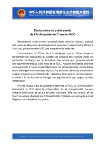 L’Ambassade de Chine tient à souligner que la Chine respecte strictement les résolutions du Conseil de sécurité des Nations Unies en particulier l’embargo sur la fourniture des armes aux groupes armés anti-gouvernementaux dans l’est de la RDC. Aucune entreprise chinoise n’est autorisée à nouer des contacts avec les groupes armés locaux. Dans leurs échanges commerciaux légaux, les sociétés chinoises d’armement exigent toujours la certification de l’utilisateur final auprès de leurs clients, et veille à la conformité de l’usage des équipements par rapport à cette certification.