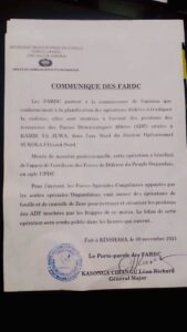 Le général Major Kasonga Cibangu Léon Richard qui signe ce communiqué souligne que les forces spéciales Congolaises appuyées par les unités spéciales ougandaises vont mener des opérations de fouille et de contrôle de zone pour nettoyer et sécuriser les positions des ADF touchées par les frappes de ce matin.
