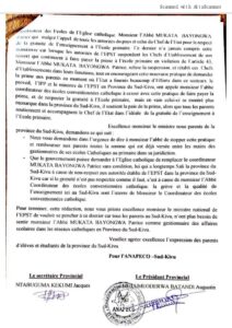 Aussi, elle demande au Ministre national de solliciter de l’Eglise catholique le remplacement de cet Abbé Coordinateur qui a fait la honte de la Province par son insoumission aux autorités de l’EPST/Sud-Kivu.