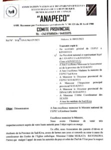 Vendredi, 17 mars 2023 – Dans une correspondance adressée au Ministre de l’Enseignement Primaire Secondaire et Technique (EPST), le Professeur Tony Mwaba Kazadi, dont une copie est parvenue à Okapinews.net l’Association Nationale des Parents d’Élèves et d’Étudiants de la RDC, ANAPECO/Sud-kivu a dénoncé ce qu’elle qualifie de la cupidité et la course effrénée au lucre de Monsieur l’Abbé Mukata Bayongwa Patrice, Coordinateur provincial des Écoles conventionnées catholiques du Sud-Kivu.
